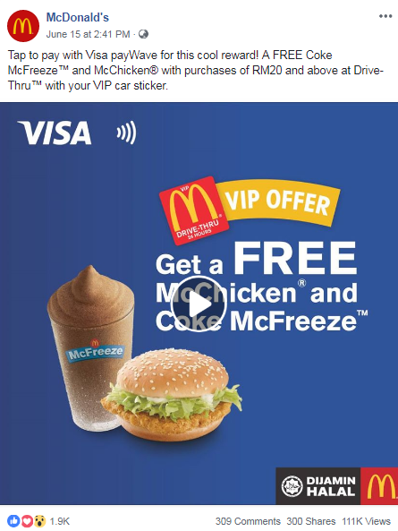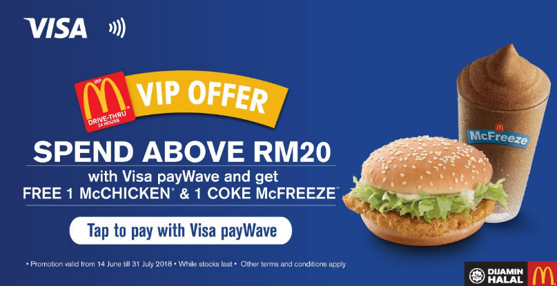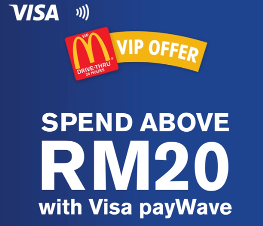 优惠条件:必须拥有McDonald’s VIP Car Sticker; 必须使用Visa Pay Wave付款;消费满RM20.