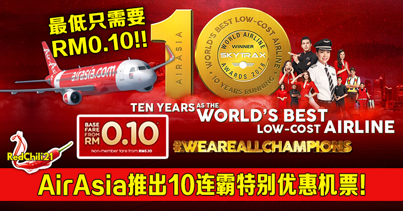 被誉为「航空界奥斯卡」的Skytrax榜单在7月17日出炉,亚洲低成本航空领导品牌AirAsia连续10年夺得世界最佳低成本航空奖。为庆祝十连冠, AirAsia推出10连霸特别优惠机票, 最低只需要RM0.10!!