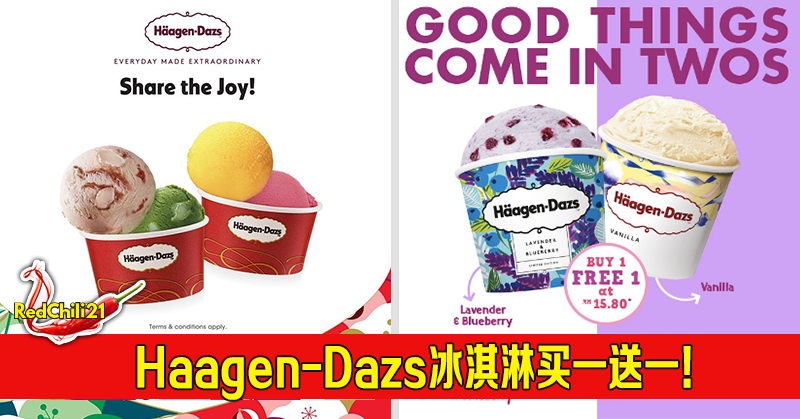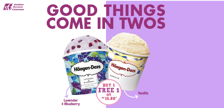 优惠条件:凡是在特定的Golden Screen Cinema购买Häagen-Dazs Mini Cup (100mL)的冰淇淋,就能享有免费的冰淇淋一个。只限Vanilla & Blueberry口味(东马只限Vanilla口味)。存货售完为止。
