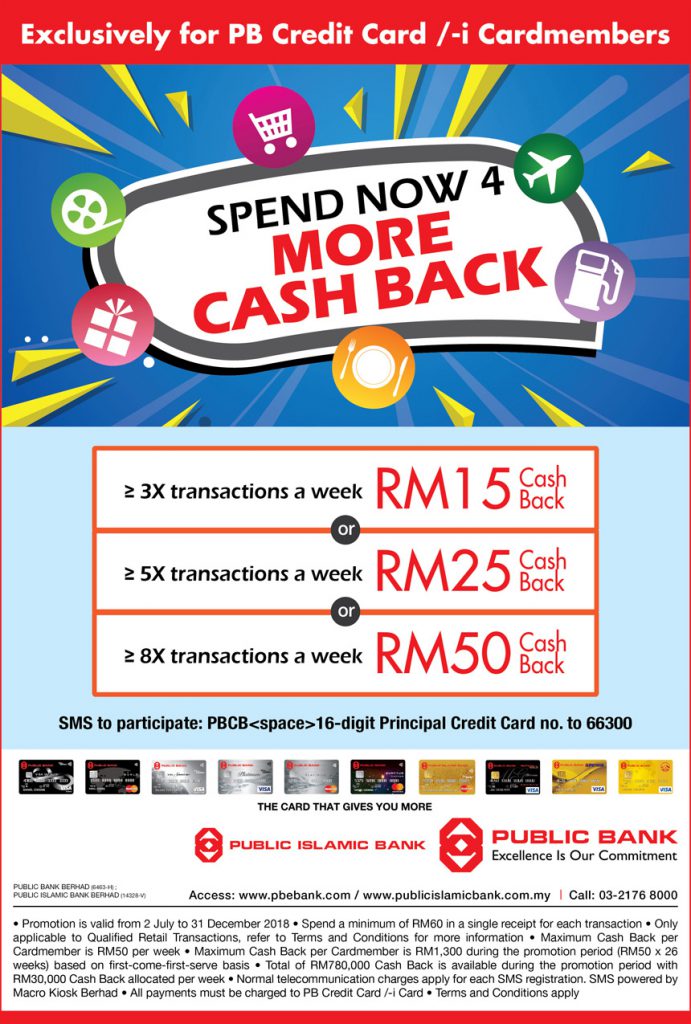 大众银行(Public Bank)于2018年7月2日至12月31日推出“Spend Now 4 More Cash Back” 信用卡优惠。凡是在这段时间刷卡消费的大众银行信用卡用户,就可获得每周最高RM 50的优惠。