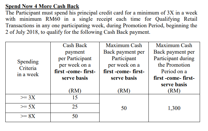 持卡人在一周内刷卡3次或以上可获得RM 15 Cash Back,还有一周刷卡5次或以上可获得RM 25 Cash Back,一周内刷卡8次或以上可享有RM50 Cashback。但必须注意的是每次刷卡的最低消费必须是RM60。