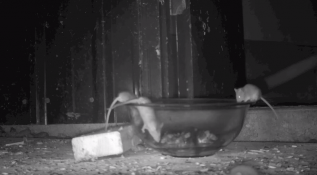 ▼慢慢的,越来越多老鼠被引来了,但是它们还在碗上试着往下偷吃花生油。