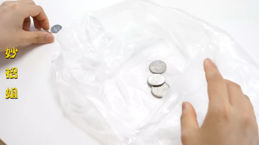 ▼然後在塑料袋中裝入四到六枚的硬币。