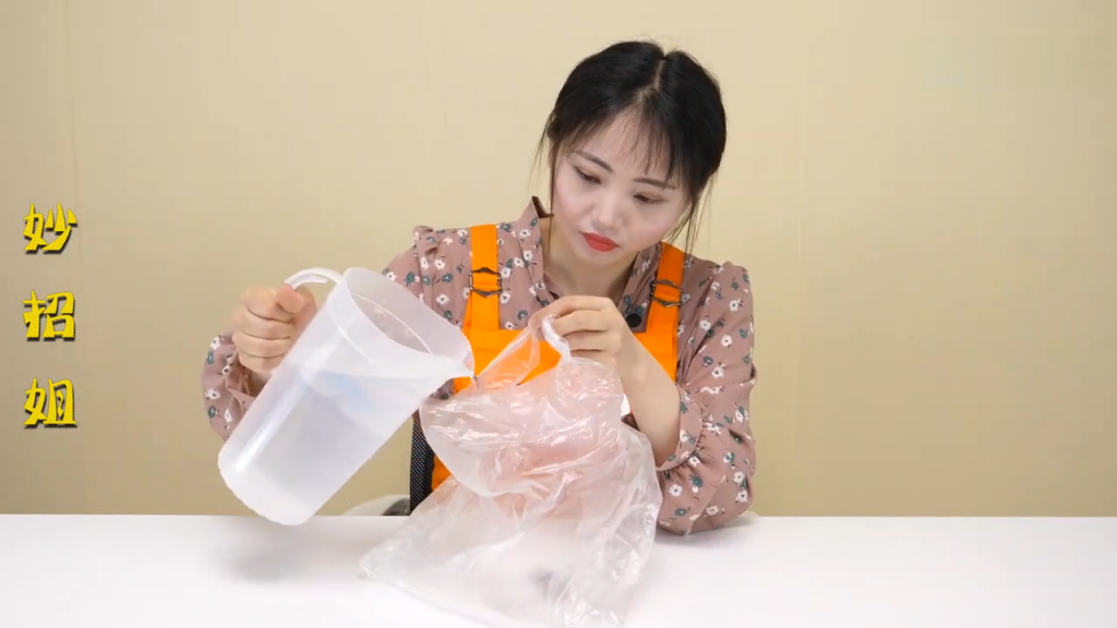 ▼然後再往塑料袋裡面倒入清水,水只要加半袋就可以了。