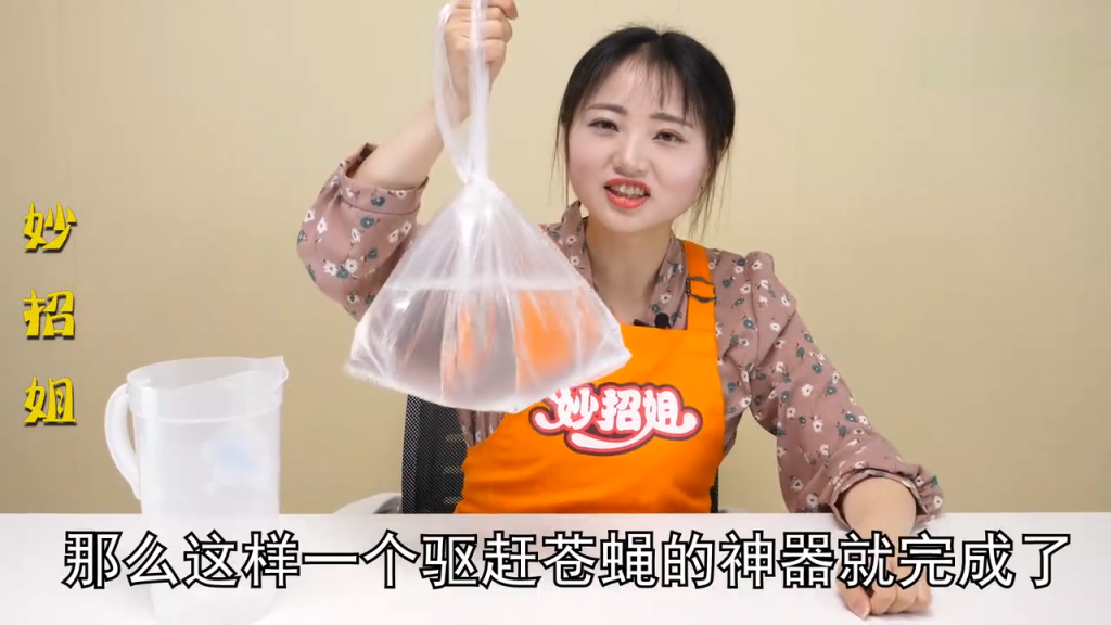 ▼加好水后,再把袋口系好。这样一个驱赶苍蝇的神器就做好了。