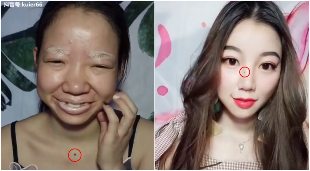 ▼眼尖的网友也发现原本在脖子上的痣在化妆后长到鼻梁上了!(所以到底是不是同一个人?!)