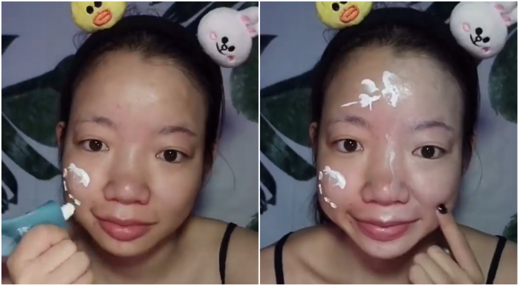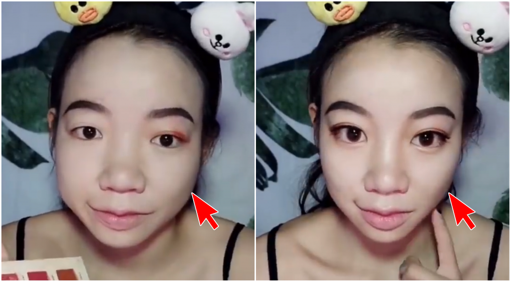 ▼画好妆后,看到她用了一块疑似「胶带」贴着右脸,对比起来让左脸看了还是肉肉的。