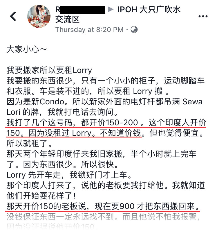 数日前,一位女事主在网上贴文表示租lorry搬家但却遇到了不老实的搬运公司搬了东西才坐地起价所以提防大家要多小心。此贴文也引起了很多网友的关注和转发。