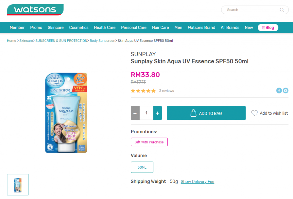 ▼不得不说的是这个Skin Aqua UV Watery Essence在Watsons的售价都要RM33.80了,还免费包邮送到你家门口,所以女孩们千万别错过哦!