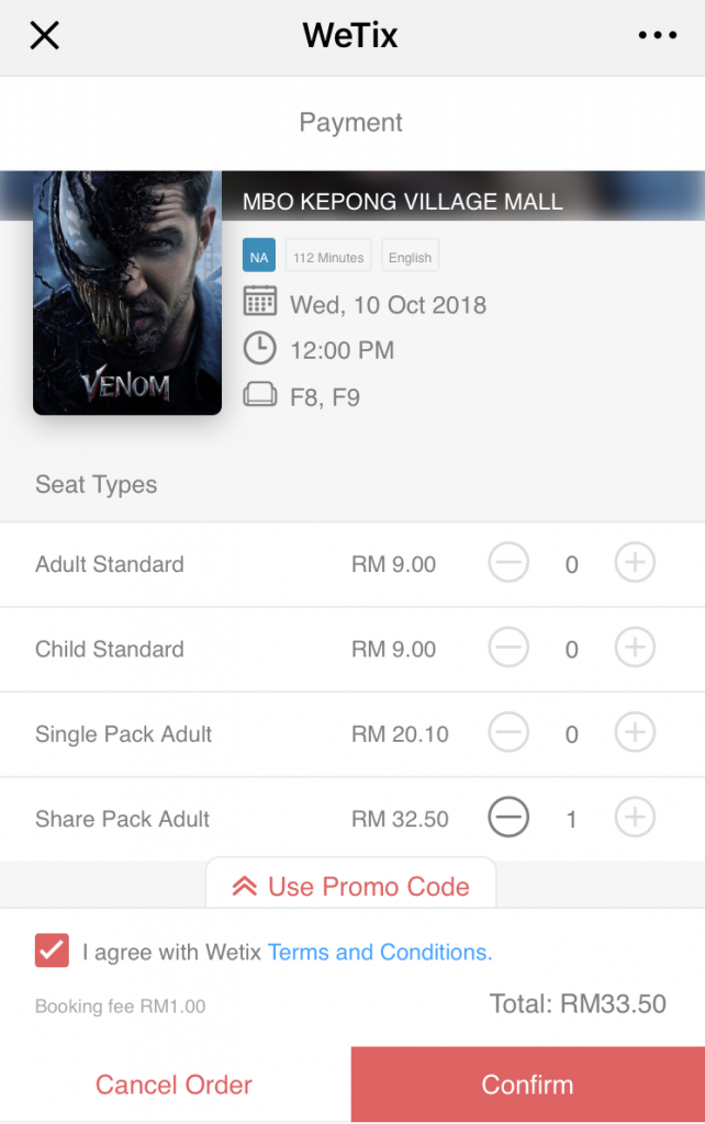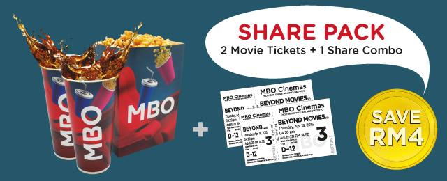 如果你们是用wechat pay订购MBO Share Pack Adult的话,2人只需RM23.50 (*不同地方的戏院可能会有不同的价钱),所以换句话一人差不多是RM11.75就能享有戏票+大杯饮料+大桶爆米花。