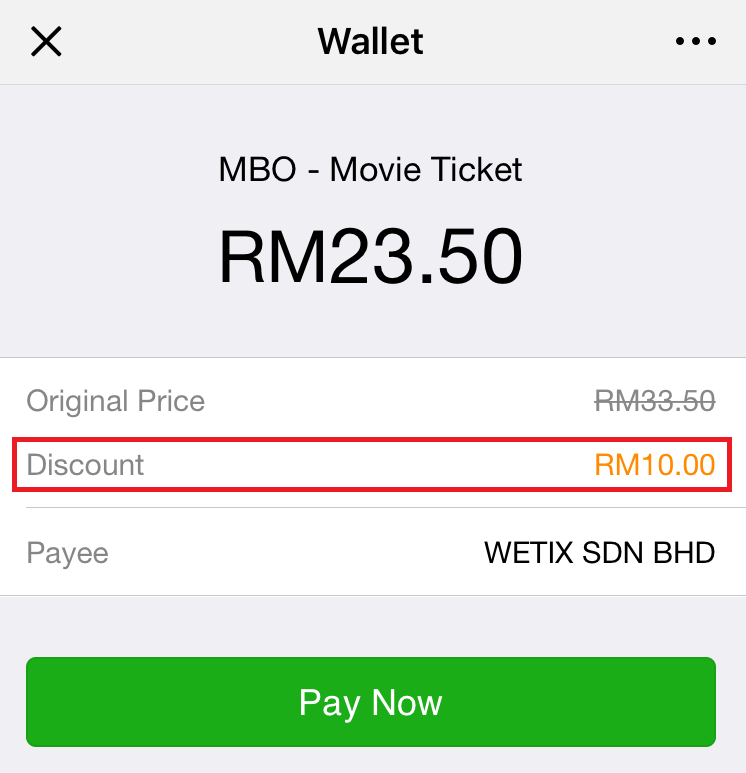 促销活动:大马微信支付订购电影票满RM30立即得到RM10折扣优惠。