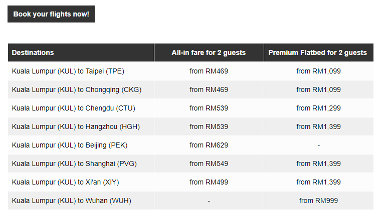 - Promotion is applicable on selected flights between Kuala Lumpur (KUL) to/from Chongqing (CKG), Chengdu (CTU), Hangzhou (HGH), Beijing (PEK), Shanghai (PVG), Wuhan (WUH), Xi’an (XIY) and Taipei (TPE) only.