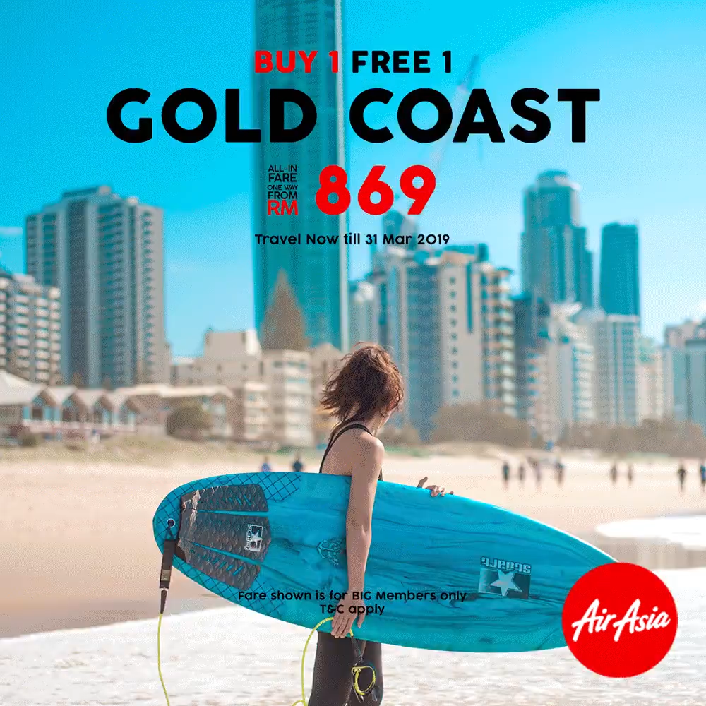 ▼黄金海岸 (Gold Coast) 机票买一送一从RM869起。
