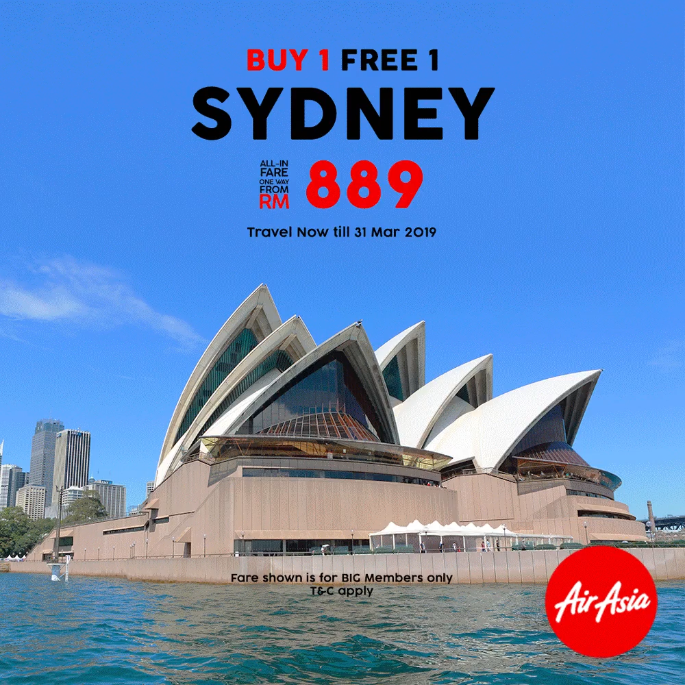 ▼悉尼 (Sydney) 机票买一送一从RM889起。
