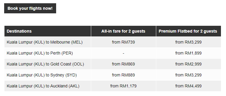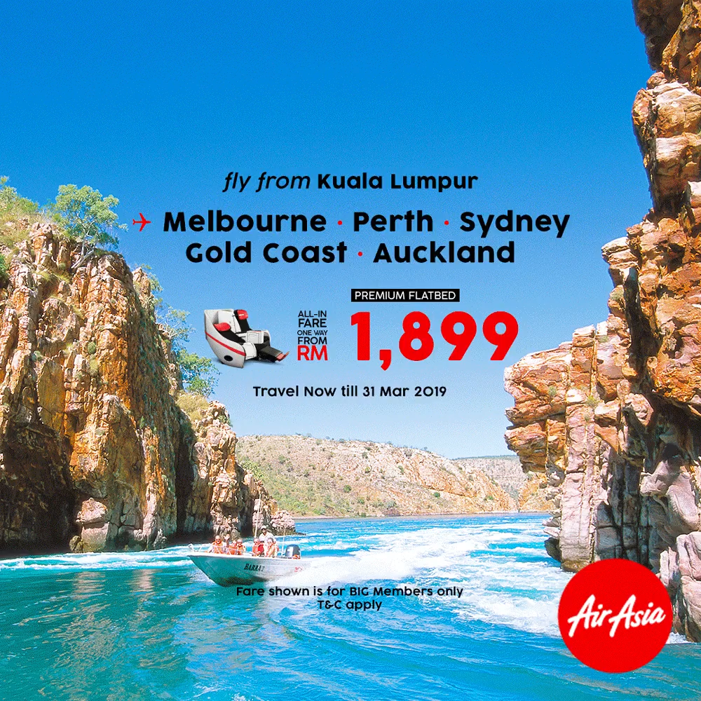 1. Promotion is applicable on selected flights between Kuala Lumpur (KUL) to/from Melbourne (MEL), Perth (PER)Sydney (SYD)Gold Coast (OOL) and Auckland (AKL) only.