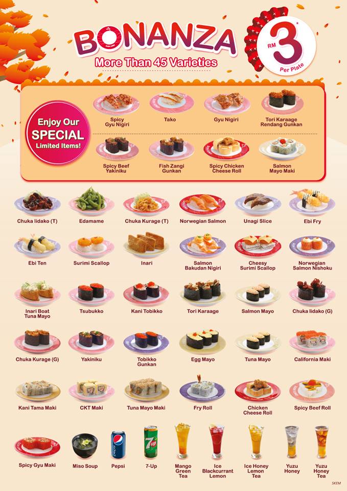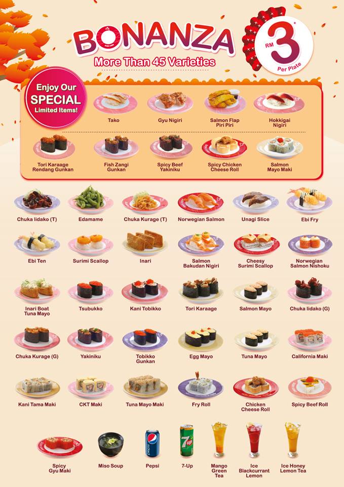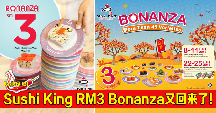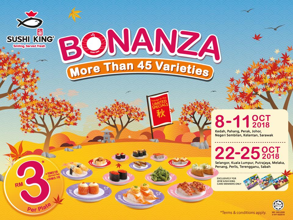 Sushi King 分两个阶段在全马举行 Sushi King Bonanza。在Sushi King Bonanza 中,将有多达45样的Sushi 可选择。每碟寿司只需 RM 3哦!