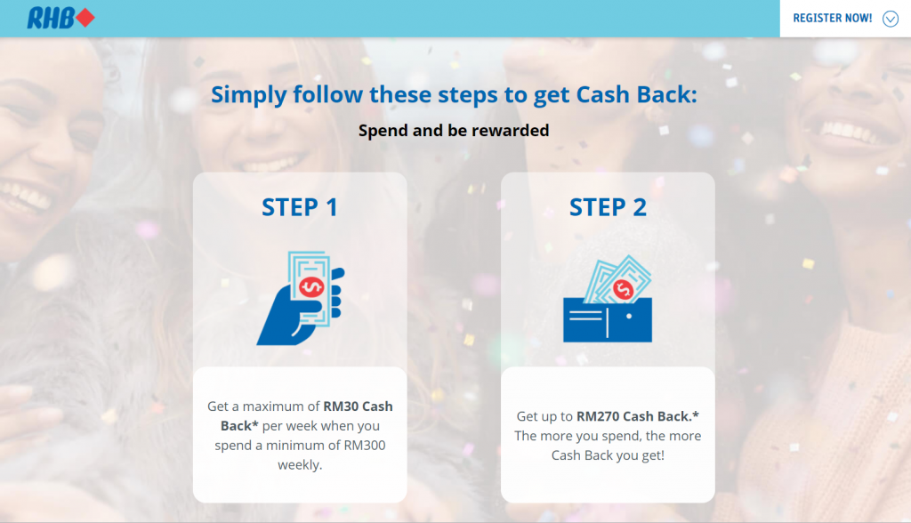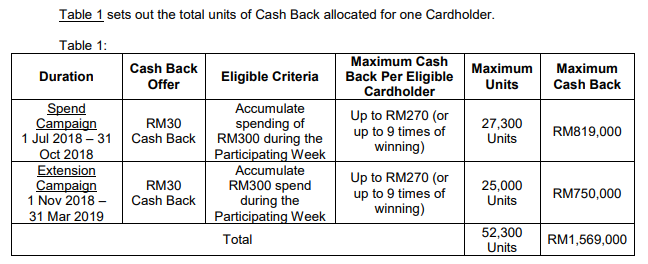 持卡人在一周内必需消费RM300或以上或以上就可享有RM30 现金回扣 (Cashback)。