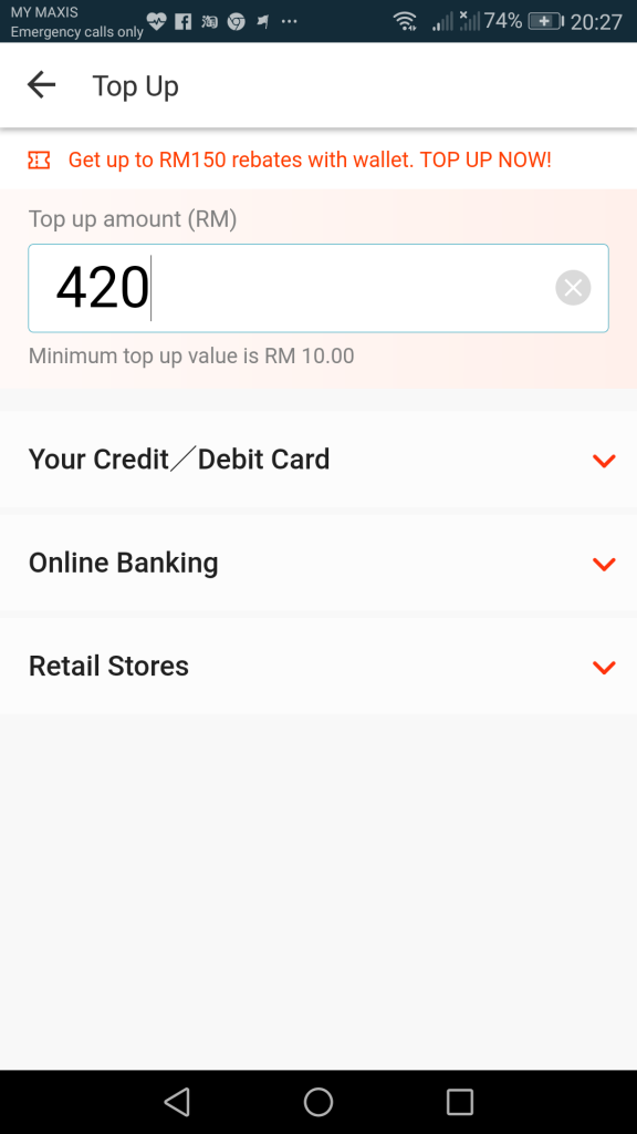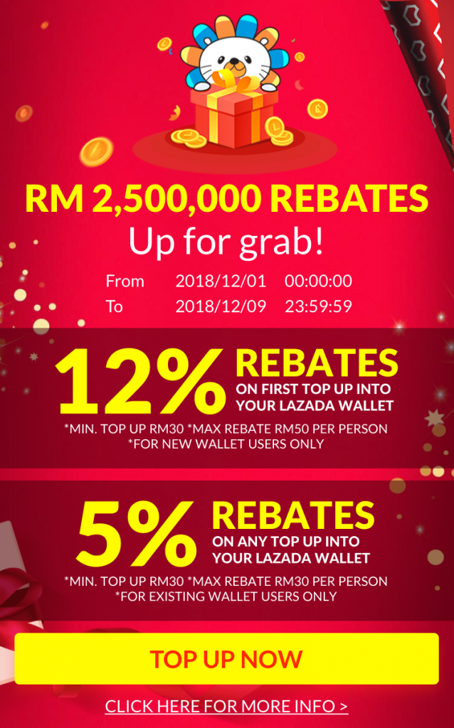 *由于新用户将得到12%的加额回扣然后得到最高的RM50购物卷,所以新用户只需加额大约RM417就能获得RM50购物卷。