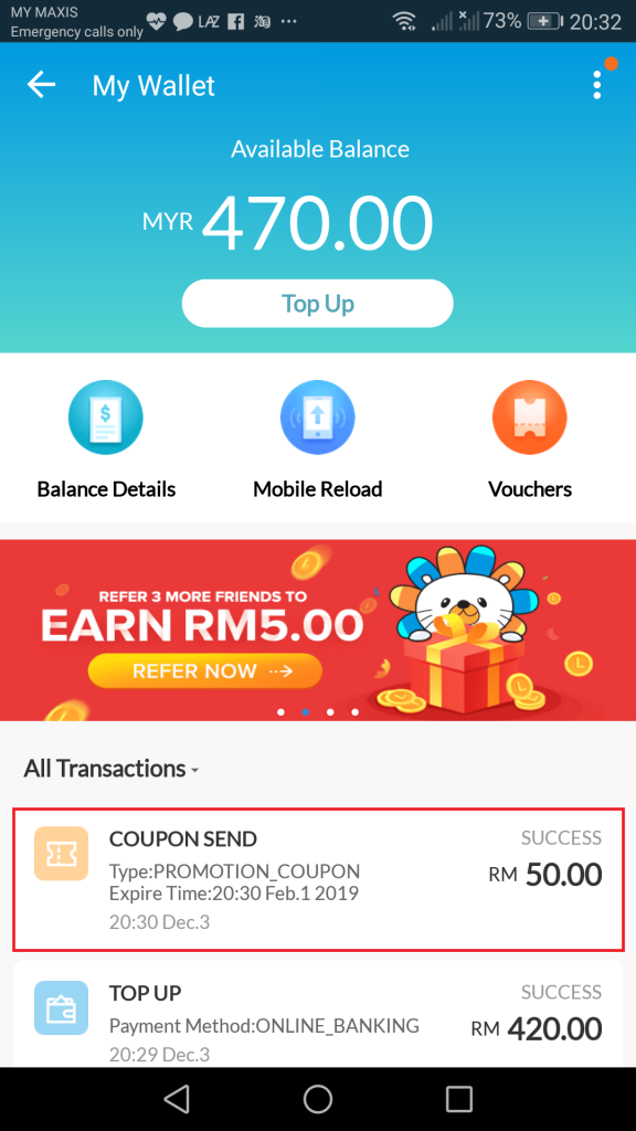 方法很简单,就是前往你的”Lazada Wallet“然后加额(Top Up)就能获取高达RM50的购物券!