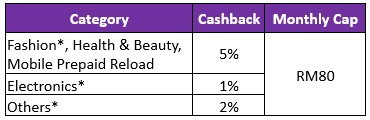 (b) from the period of 1st October, the cumulative cashback is limited to Ringgit Malaysia Eighty (RM 80.00) a month depending on the category of items purchased for each Lazada account; and