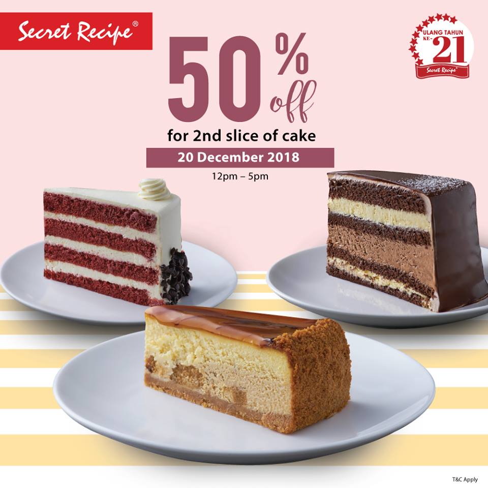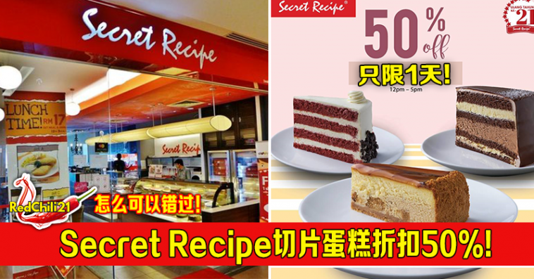 Secret Recipe将在12月20日推出50%折扣的蛋糕优惠!这项活动只限于中午12点至傍晚5点。凡是在促销期购买1片蛋糕(原价),就能以50%的折扣价购买另外1片蛋糕(50%折扣的蛋糕必须低于第一份选购的蛋糕价格或是同等价格)