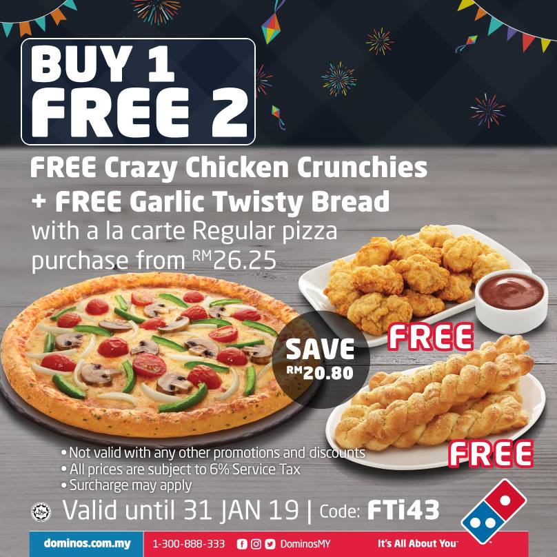▼FTi43 – BELI 1 PERCUMA 2: Crazy Chicken Crunchies + Garlic Twisty Bread PERCUMA dengan pembelian a la carte Piza Sederhana