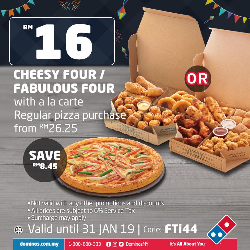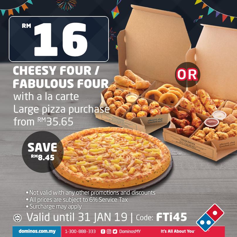 ▼FTi45 – CHEESY/FABULOUS FOUR pada harga RM16 dengan pembelian a la carte Piza Besar