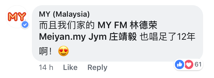 ▼MY FM也在留言指出他们家的林德荣,颜薇恩和庄靖毅都唱足了12年。