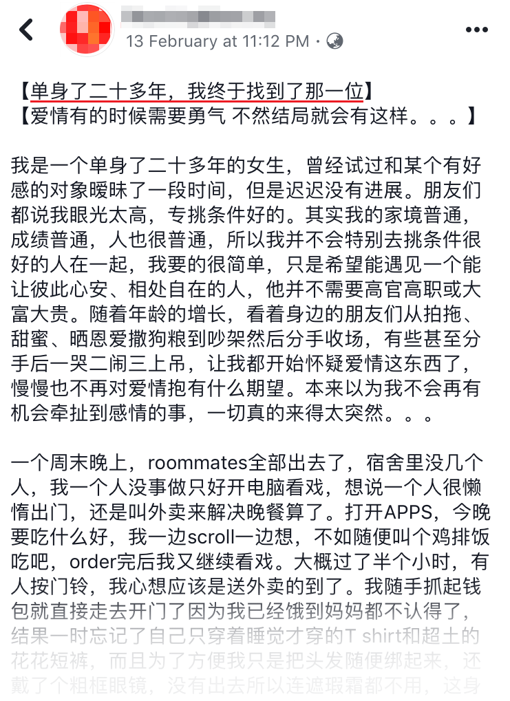 情人节前一天,脸书上流出了一个帖文关于一名女生订购外卖订出感情来的故事。