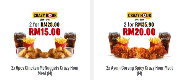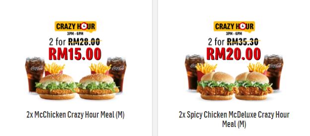 ▼ 2x McChicken Crazy Hour Meal (M) 现在是 RM15.00(原价 RM 28.00)!