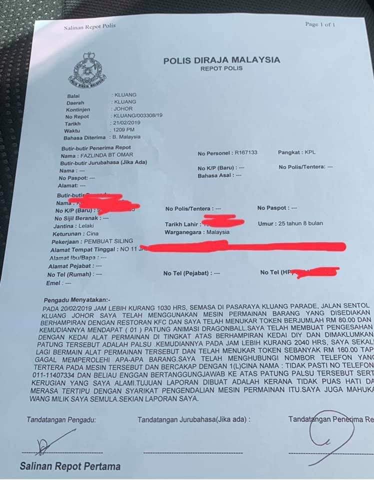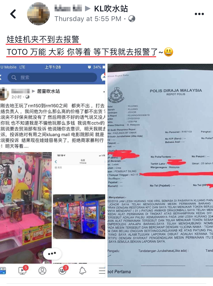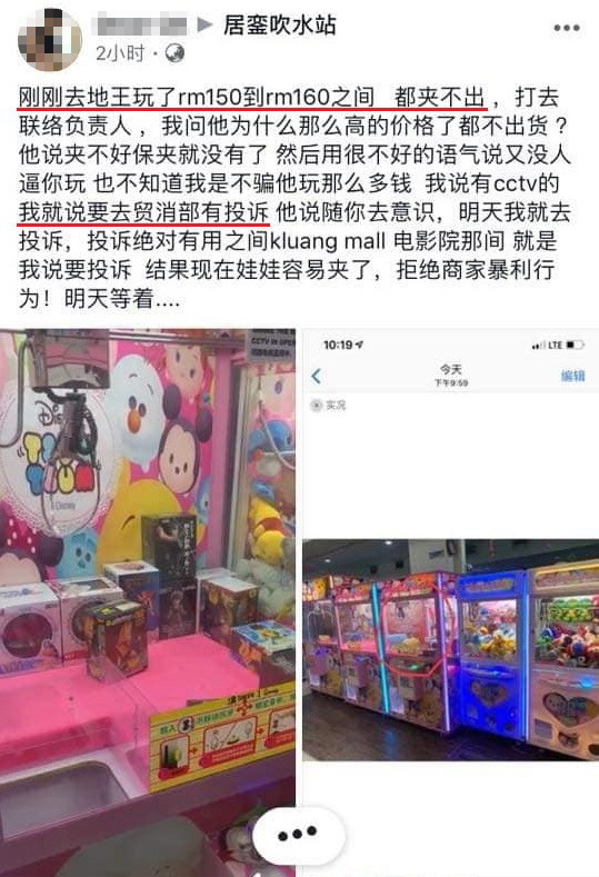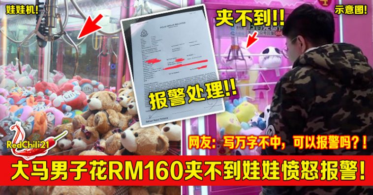 数日前,一名网友在吹水站发文表示花了RM150-RM160夹娃娃但都没成功夹到所以愤怒报警。