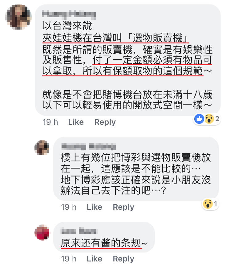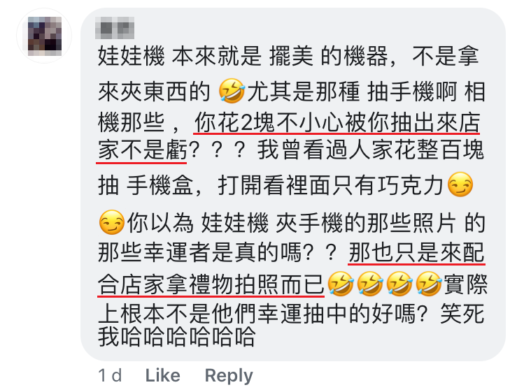 ▼也有网友表示夹娃娃机在台湾叫「选物贩买机」,所以付了一定的金额必循有物品可以拿取的。