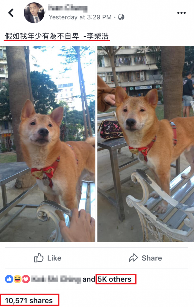 昨日,有一位男网友在脸书贴了两张狗的照片然后附上了李荣浩的一段歌词:“假如我年少有为不自卑”竟然突然爆红了,至今已有超过1万人分享和5千个赞。
