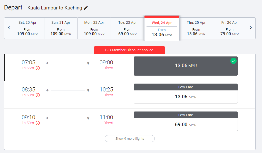 ▼有图有真相!从吉隆坡飞往古晋,单程机票只需RM13.06。