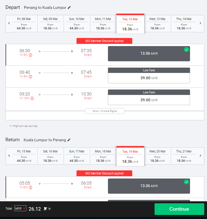 ▼槟城飞往吉隆坡来回机票只需RM26.12。