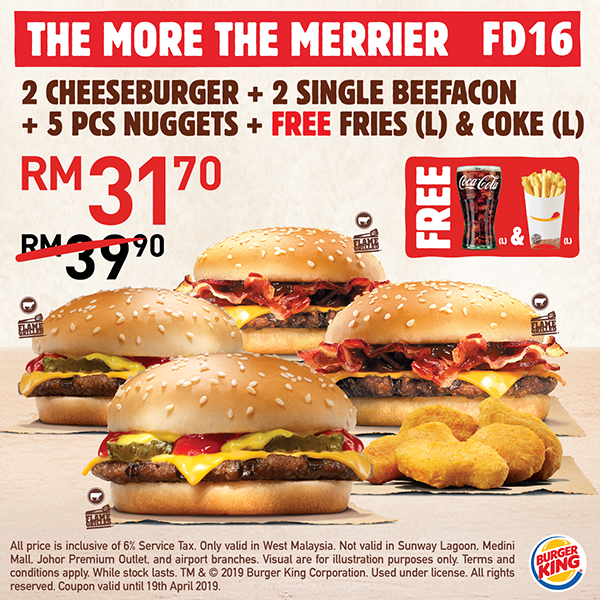 ▼2份 Cheeseburge + 2份 Single Beefacon + 5片 Nuggets + 免费薯条 & Coke仅售 RM31.70