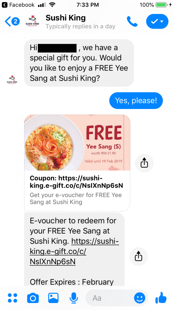 ▼回答 “Yes, Please”后,你将会收到一个E-Coupon。