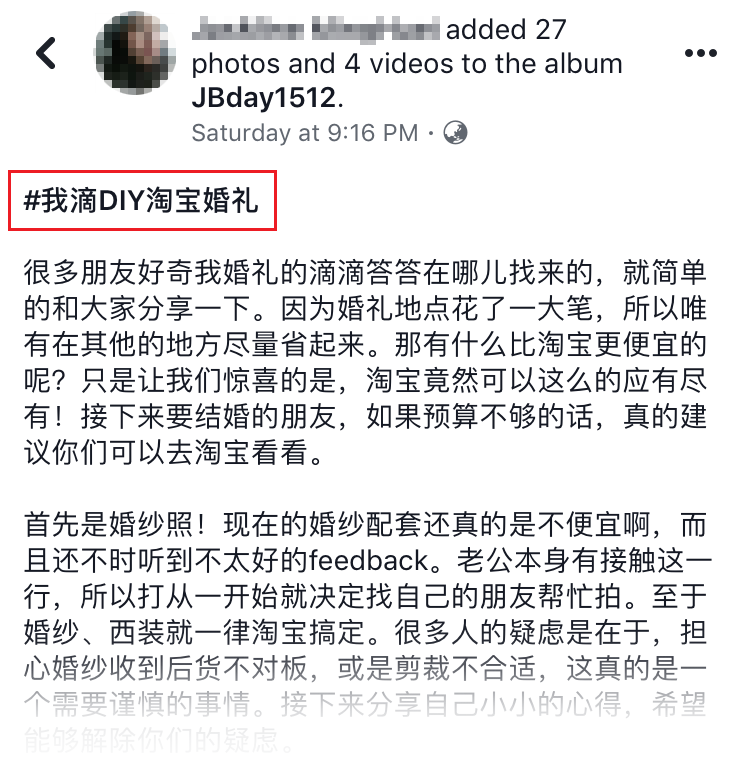 大马一位刚新婚的女生在其脸书分享了她的个人婚礼的筹备并表示其实很多婚礼上用到的东西都可以从淘宝购买到。