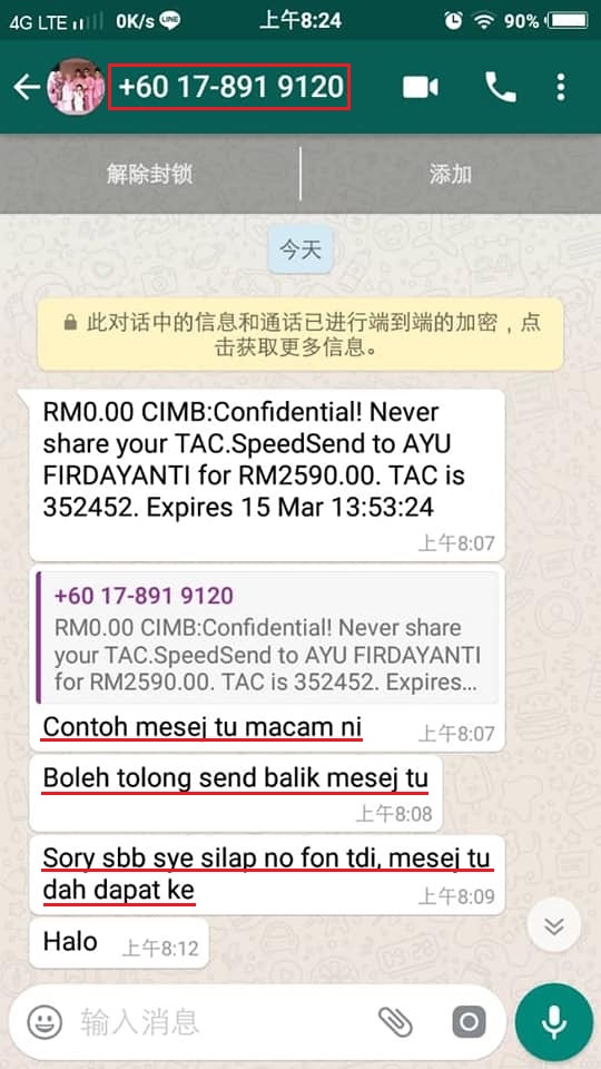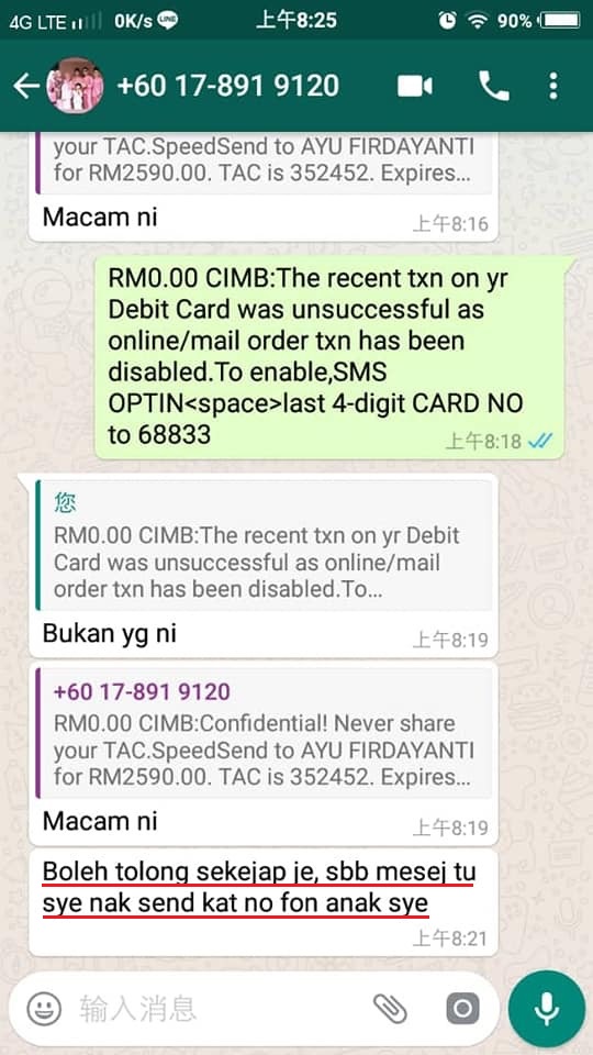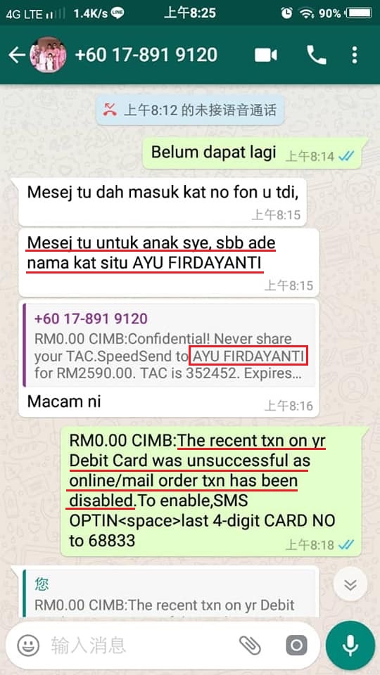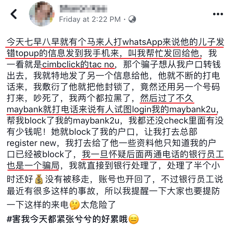 又有一位大马女子在网上讲述骗子试图Whatsapp和打电话来骗取她的转账码,而且一次2个银行中招。