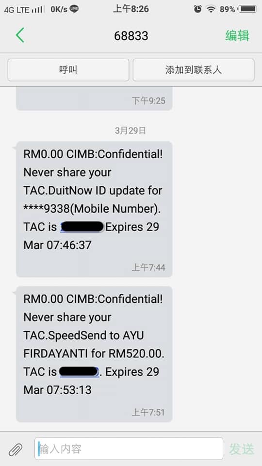 这位的女士分别收到了来自CIMB的转账码和Maybank银行职员的电话。
