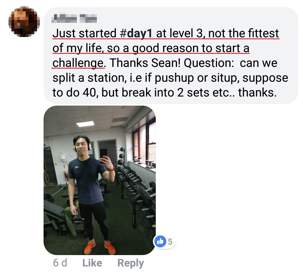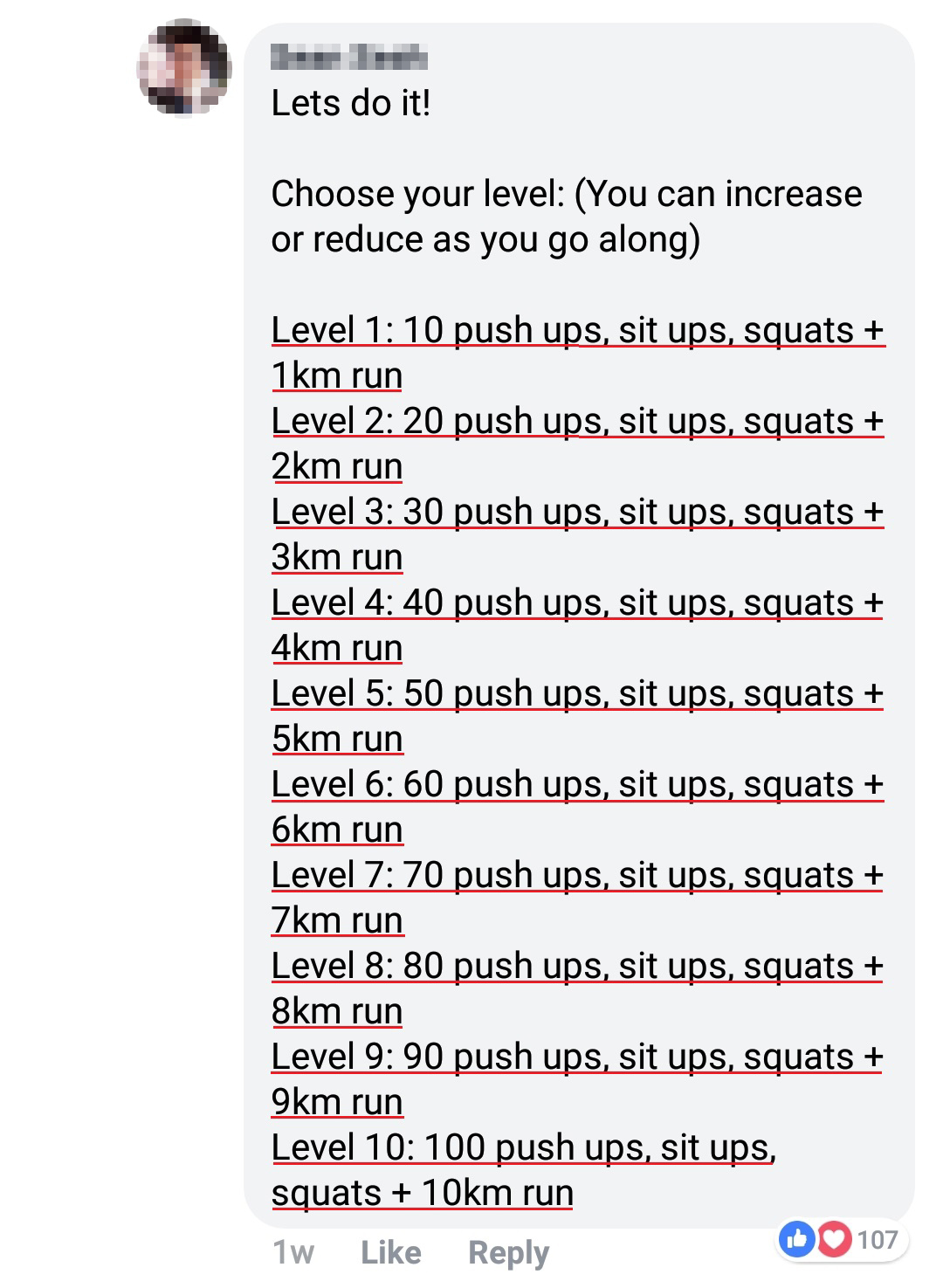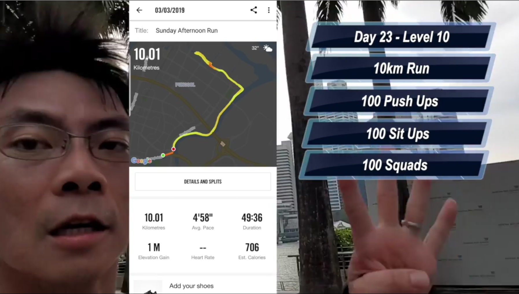 ▼ 每天100个Push-up、100个Sit-up、100个深蹲(Squat)以及10公里跑步!
