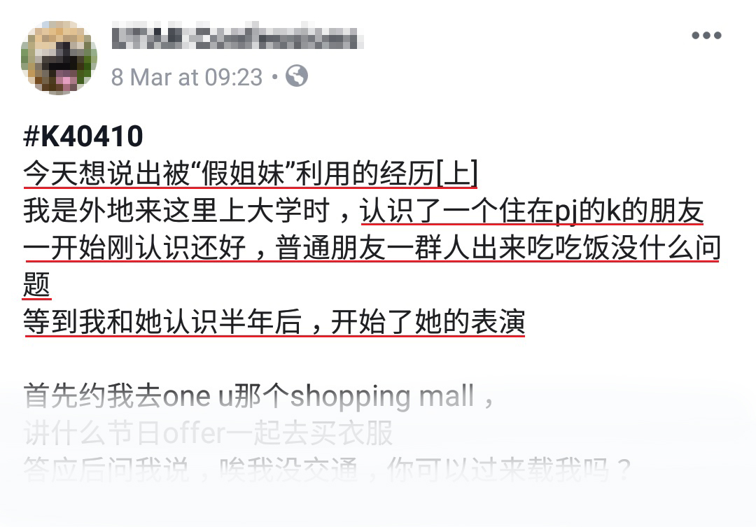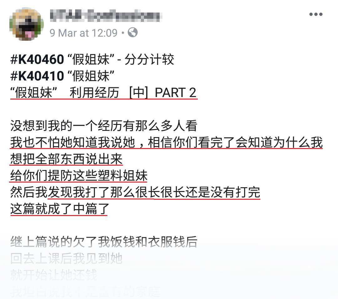 当时我就好奇什么事情一个多月处理不完,她就叫我去她家,她那边的货给回我。我就叫我家人载我去她公寓。到了公寓我进去后,打电话叫她下来带我上去,谁知道她回我“我冲凉了不想下去,我在Block C xx楼”[老娘忘记多少楼什么门牌了],叫我自己找自己上去就盖了我电话。我当时是wtf那么大片公寓你要我自己找?你下来一下会死?过后我就去问保安,幸好保安给我指路,我就顺利上去了。