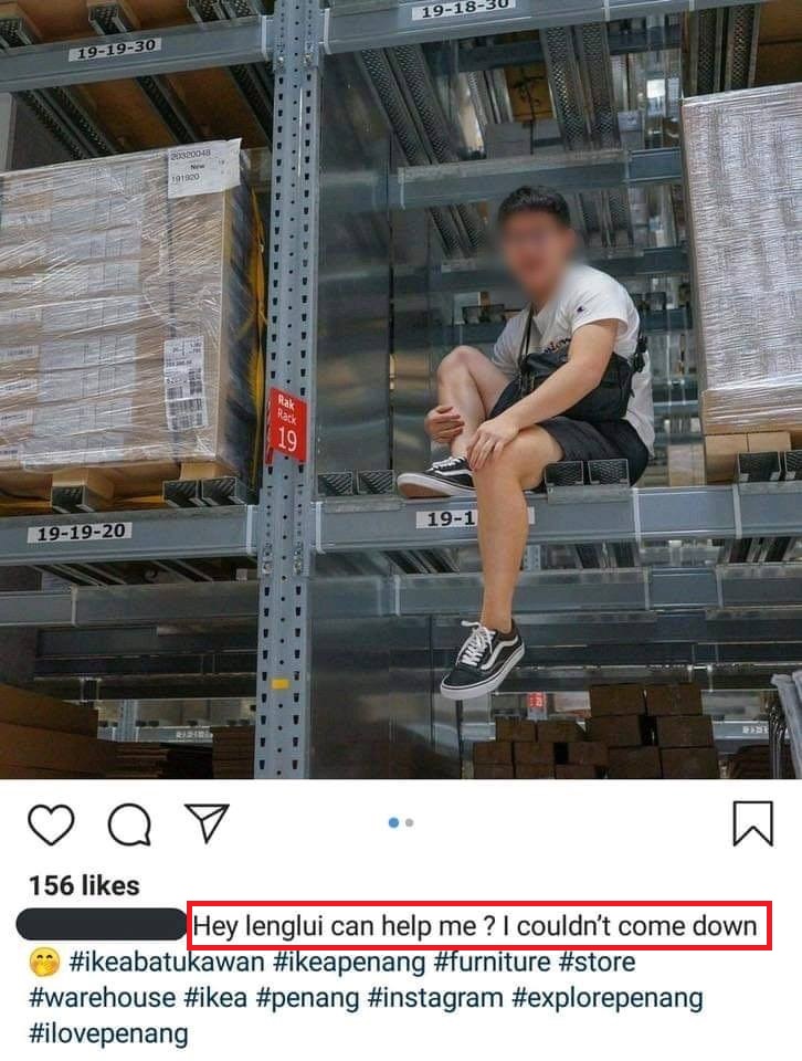 昨日Penang Kini上载了一张有关一位男子爬上IKEA货舱货柜架的照片,估计该男生是为了在Instagram晒图赚取“Likes”结果引来了网民的议论纷纷。