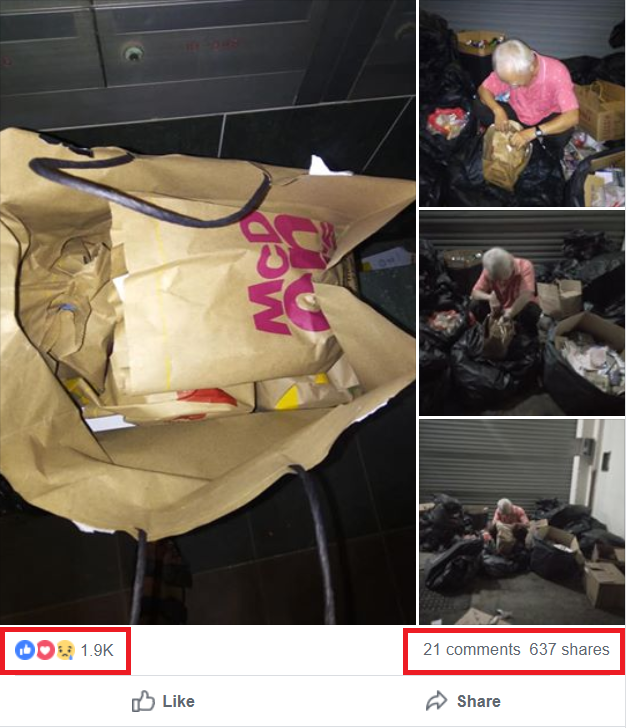 就在这时候,外送人员就遇上一位 76 岁的老人,坐在垃圾堆里。外送人员不愿意浪费食物,同时又看到这位老人似乎需要这包餐点。于是他灵机一动,就把手上的餐点都送给了这位老人。