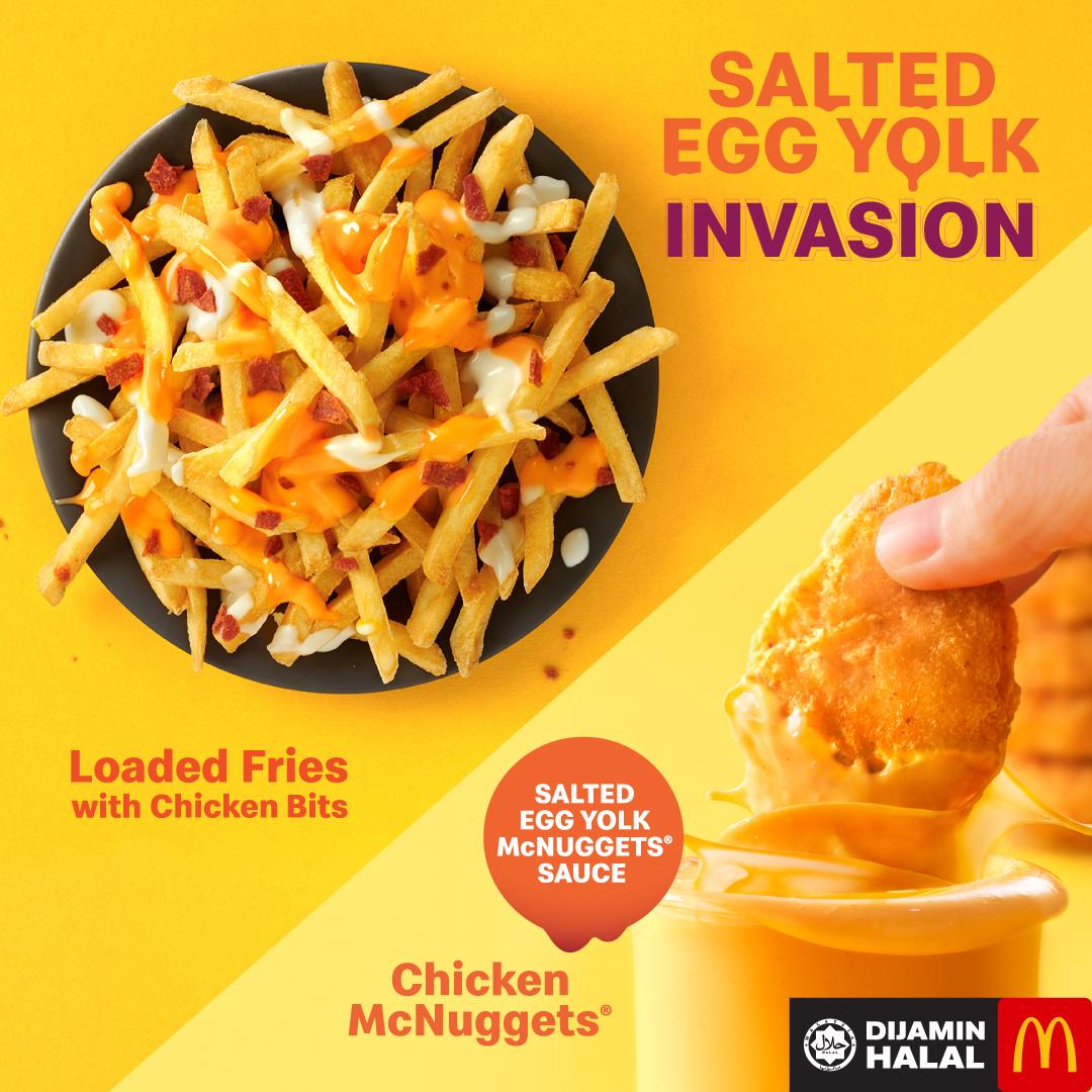 即日起,麦当劳推出全新系列的食品—— Salted Egg Yolk Invasion!此系列中有 2 种选项:薯条搭配炸鸡粒(Loaded Fries With Chicken Bits)和炸鸡块(Chicken McNuggets)。