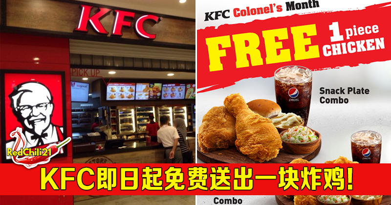促销活动:KFC Colonel’s Month 免费额外送出 1 块炸鸡