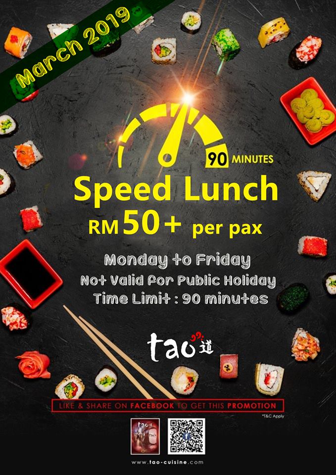 ▼ 除此之外,星期一至星期五前往 TAO 的朋友,将可以享用 RM50+ Speed Lunch 优惠,但需要注意的是这个优惠有限时 90 分钟哟~