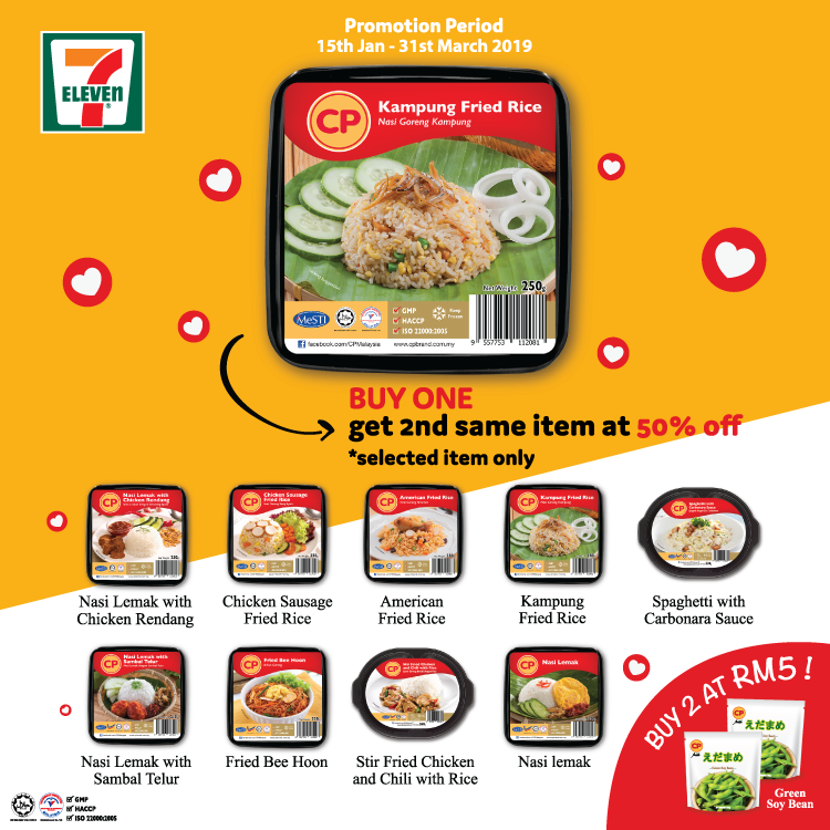 即日起至3月31日,只要在7-11便利商店购买2盒相同口味的CP冷冻膳食,第二份将会享有50%的折扣!