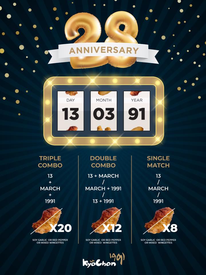 此外,日前 KyoChon 1991 为了庆祝第 28 周年纪念,特别推出了促销,免费请大家吃炸鸡块(Wingette & Drumette)!不是 1 块或 2 块炸鸡块哦,是 20 块!送你吃一大盘!