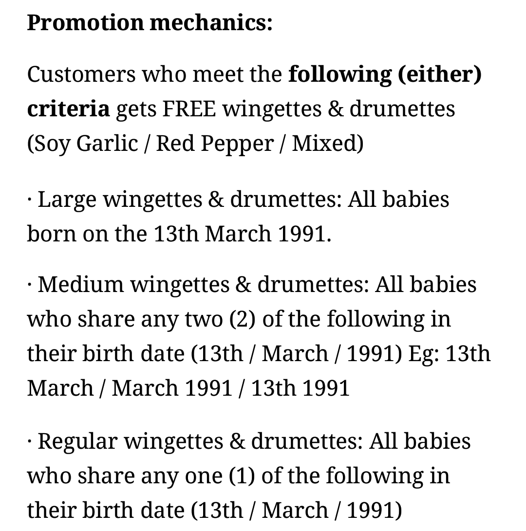 简单来说,只要你符合以上的促销条件,而你的生日又是以上所提供的日期的其中之一,那你就能吃到免费的炸鸡块咯!